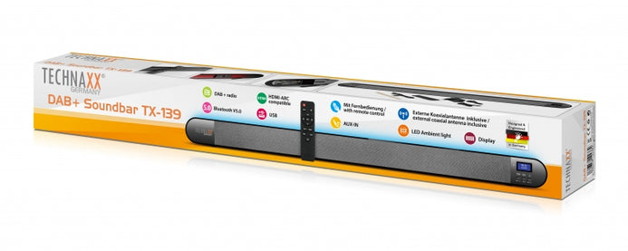 Verpackungsinhalt: - Technaxx® DAB + Bluetooth Soundbar TX-139, Netzteil, AUX-Kabel, DAB+ Antenne, Fernbedienung, 2x AAA Batterien, Gebrauchsanleitung