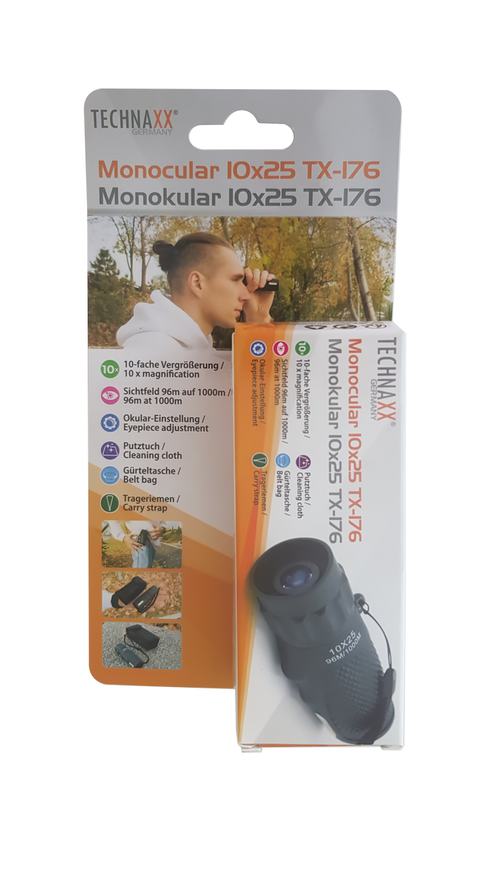 Verpackungsinhalt: - Technaxx Monokular 10x25 TX-176, Gürteltasche, Trageriemen, Reinigungstuch, Benutzerhandbuch