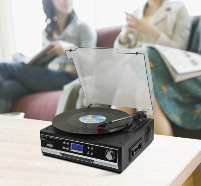 - Plattenspieler mit automatischem Stopp & 3 Geschwindigkeiten: 33, 45, 78 U/Min.